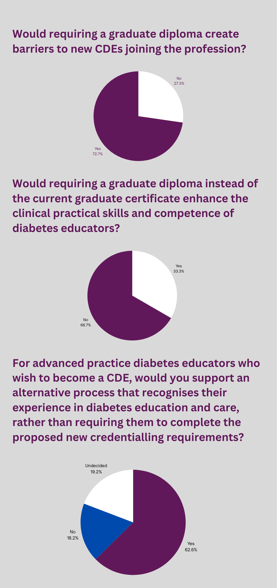 • Regarding advanced diabetes educators who want to become CDEs, 62% of respondents said they would support an alternative process that recognises their experience in diabetes education and care, rather than requiring them to complete the proposed new credentialling requirements.