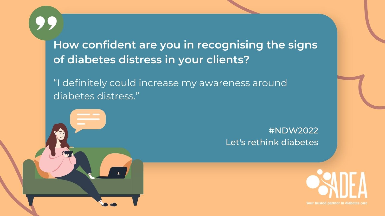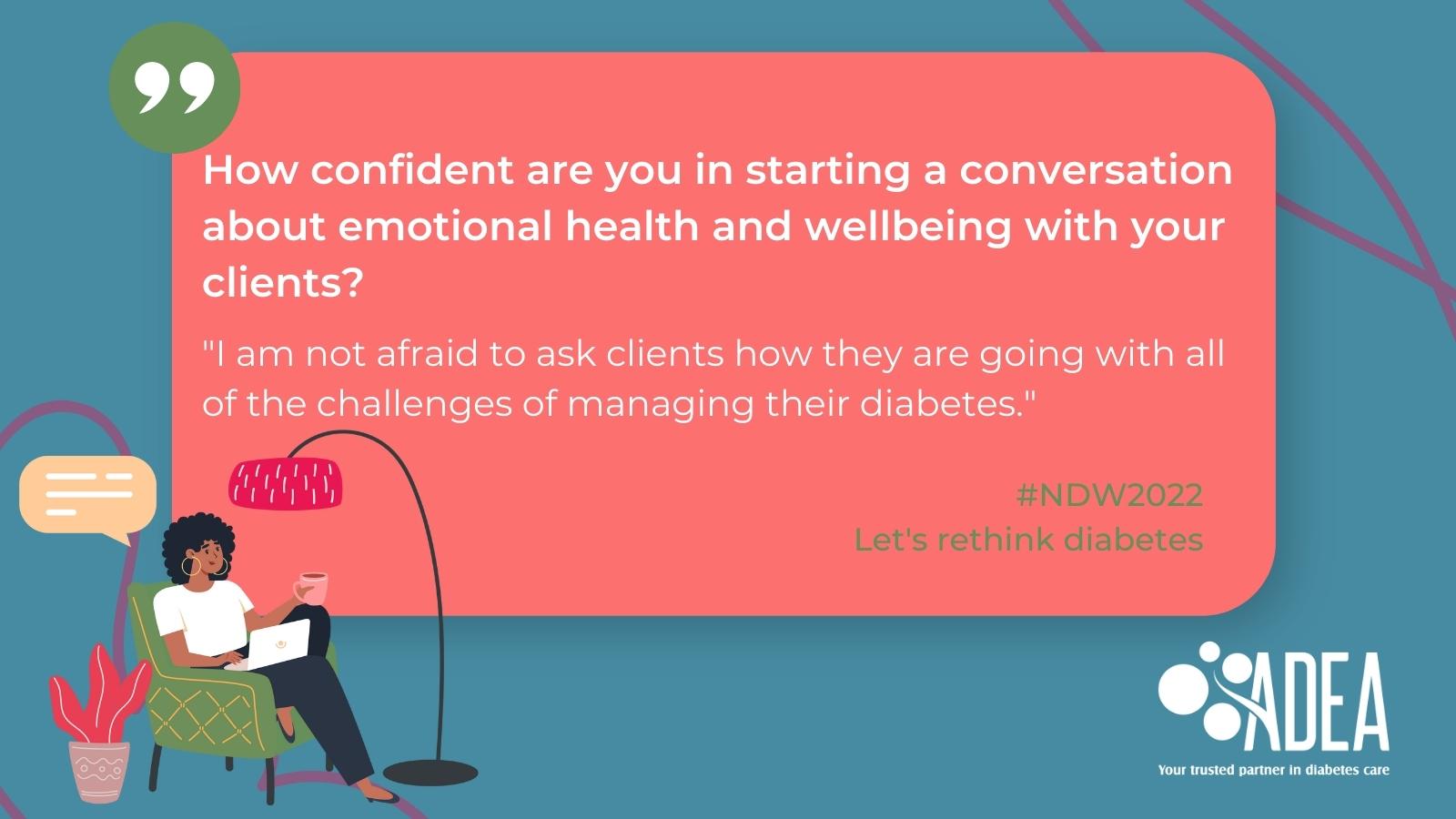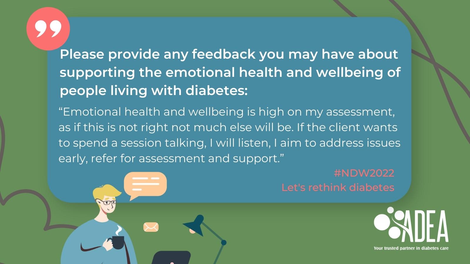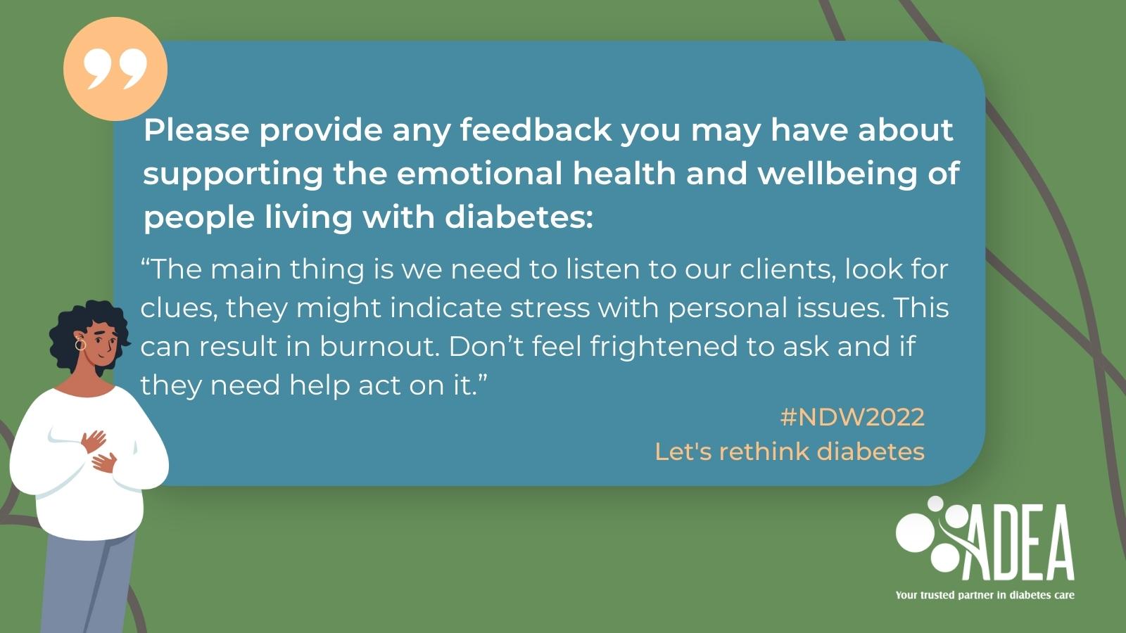 This National Diabetes Week, we want people living with diabetes, their families, friends, health professionals, and the public, to rethink diabetes. People living with diabetes may experience diabetes stigma, distress, depression, or anxiety and may also find themselves overwhelmed by the demands of self-management. The need for timely, high quality emotional and mental health care continues to increase.