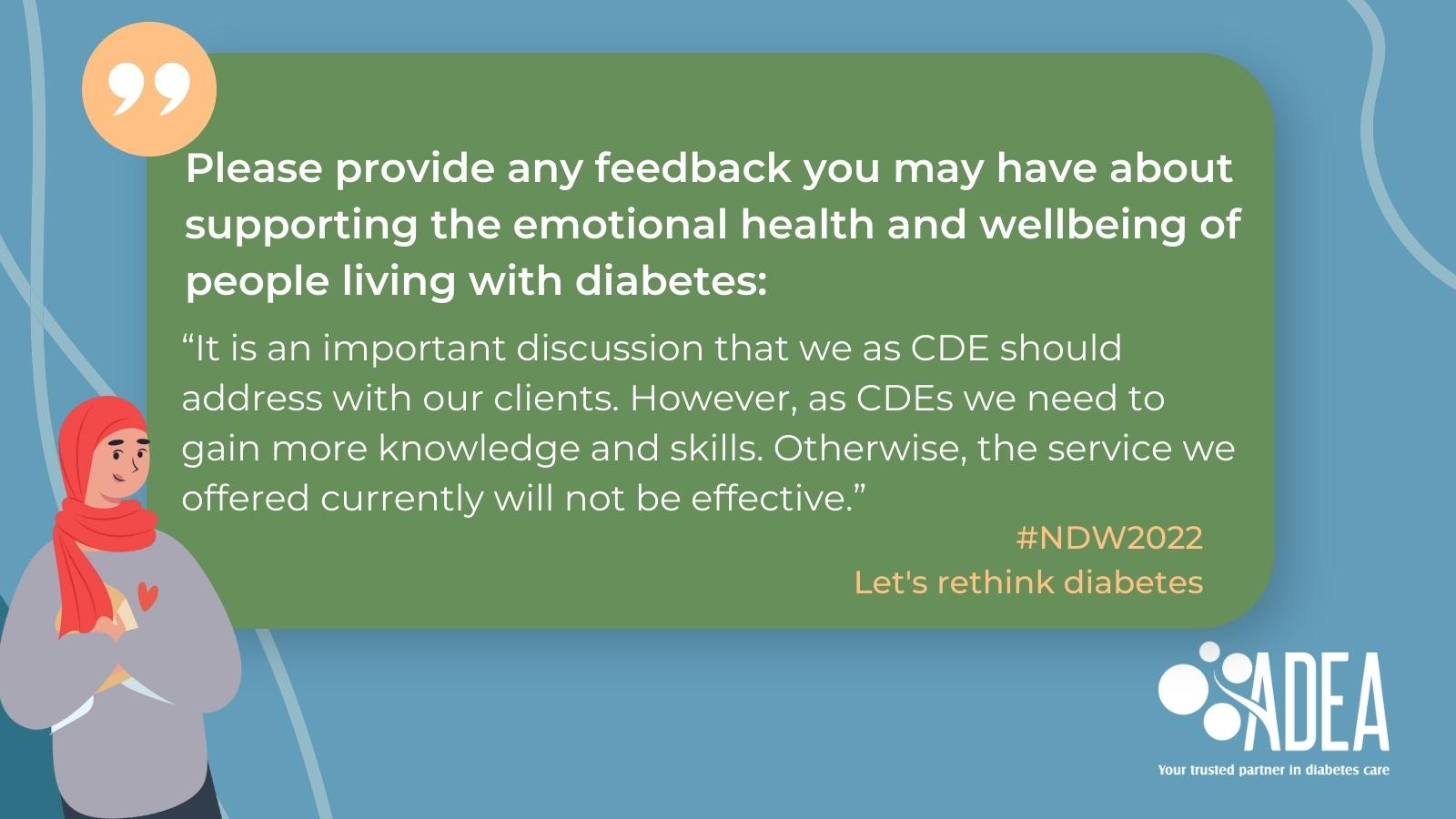 ADEA will continue to work on ways to support CDEs in their clinical practice regarding the emotional health and wellbeing of clients. We are currently establishing a CDE special interest group for mental health. If you would like to be part of this group, we would love to hear from you at [email protected].