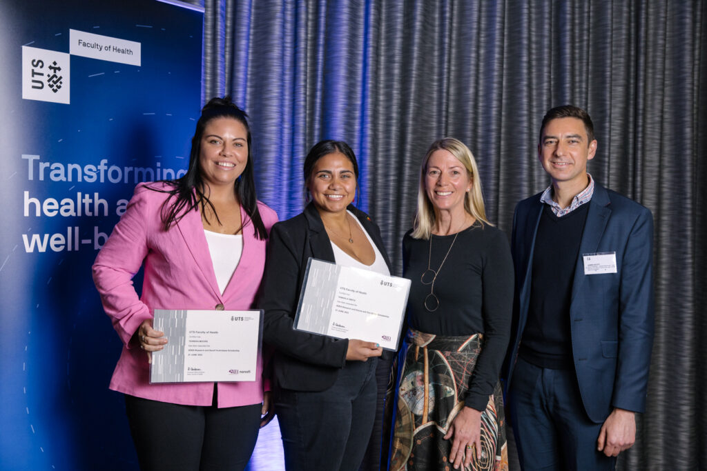 Recipients of ADEA scholarships Tanikka Moore and Tamarla Smith with ADEA President Amanda Bartlett and Sanofi’s Head of Medical James Scott at the UTS Faculty of Health awards ceremony on 21 June. Photo: UTS Faculty of Health.