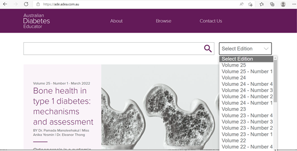 The Australian Diabetes Educator (ADE) is a quarterly publication produced for members of the Australian Diabetes Educators Association (ADEA) and is available on the ADEA website. The publication is distributed to a readership of around 2,300 ADEA members, subscribers and authors.